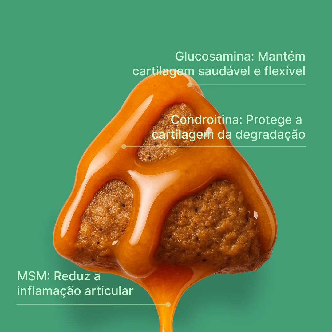 Suplemento vitamínico saboroso, com alta concentração de Glucosamina e Condroitina, que protegem as cartilagens, mantendo as articulações saudáveis e reduzindo o risco de displasia. Fácil de misturar na refeição, com resultados visíveis em 2 semanas.